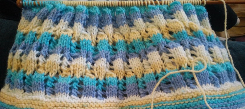 A lovely comfy knitted cardigan project, which was a free pattern from Hobbycraft. The pattern specifies a particular yarn, but as is my usual habit I will rather use whatever yarn I happen to have in my stock! This was made from a standard double-knitting weight yarn, but with a stripe pattern, rather than a single block of colour.