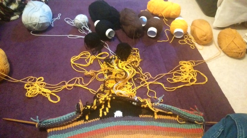 The basic jumper pattern is a simple knit, it is only the graphic cat face design which was a challenge! I chose to blend the methods of Intarsia and Fair Isle to do the multiple colour changes and keep track of my MANY yarn ends. For much of the graphic portion, I had to knit a row, put the work down and UNTANGLE all of the attached balls of yarn, before picking it up and continuing the work.