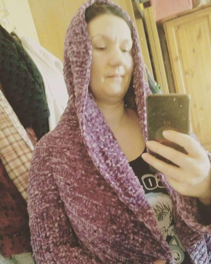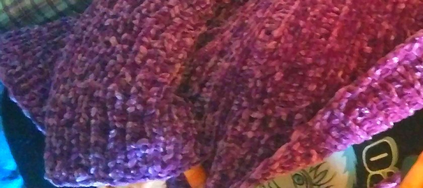 This velvet yarn is so comfortable and warm, that I have been completely living in this cardigan ever since I finished it! The very wide collar allows you to entirely wrap yourself up in it for warmth and comfort.